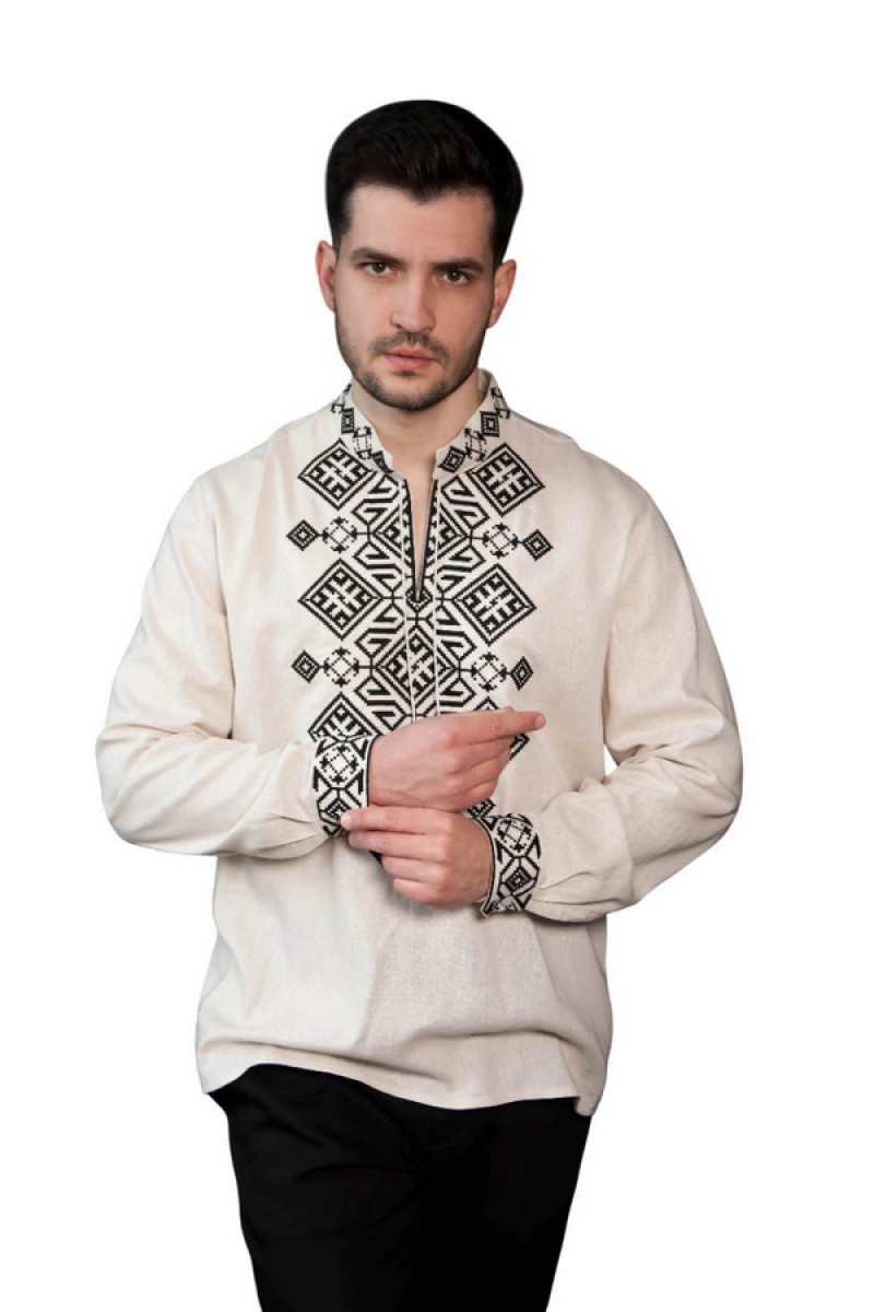 Чоловіча вишиванка "Руна" виготовлена з меланжевої бежевої тканини. Чорна вишивка прикрашає перед, горловину, манжети, додаючи урочистого вигляду. Ця вишиванка ідеально пасує до будь-якого традиційного вбрання.