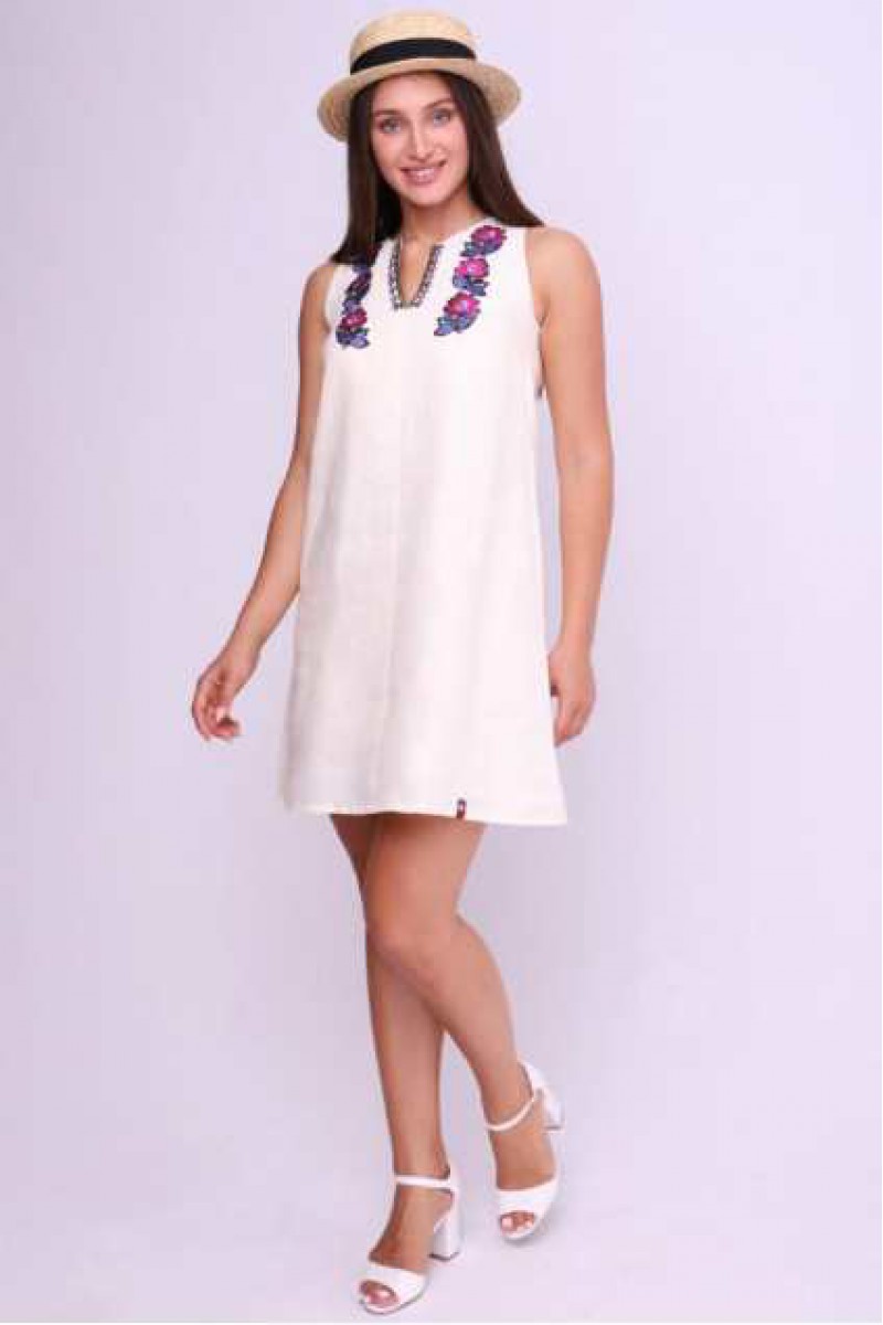 Ivory linen dress from a Ukrainian manufacturer will be a good addition to your wardrobe. The product can be worn both for holidays and on weekdays. Lightweight, pleasant to the touch, and most importantly natural fabric, does not soar and is breathable. The free trapezoidal silhouette of the dress allows you to feel comfortable. The cut of the product is free and straight, so it is suitable for women with any figure. The feature of this model is convenient side pockets. The ornament is based on elements from an old Borschiv shirt. The combination of natural linen and minimalist dress design is a recipe for success in creating a spectacular and unforgettable image!