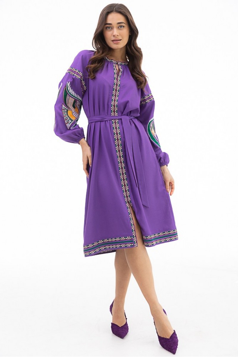 Птицы, платье-вышиванка с длинным рукавом, фиолетовое