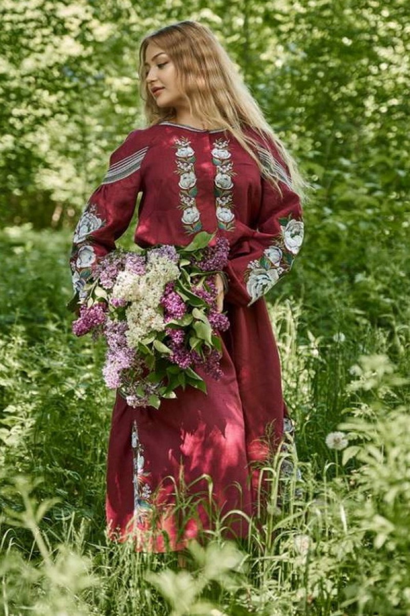 Жіноча вишита сукня з льону Півонія бордова, 52